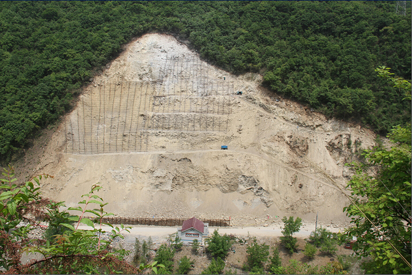 G108洋縣土地嶺段K1520+300右側(cè)山體滑坡,工程區(qū)東西長(zhǎng)80m、高程范圍1040m-1120m、高差80m。